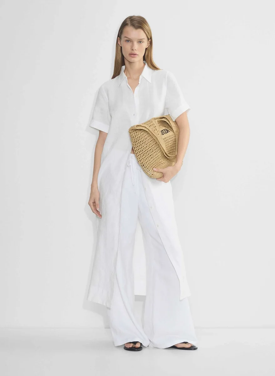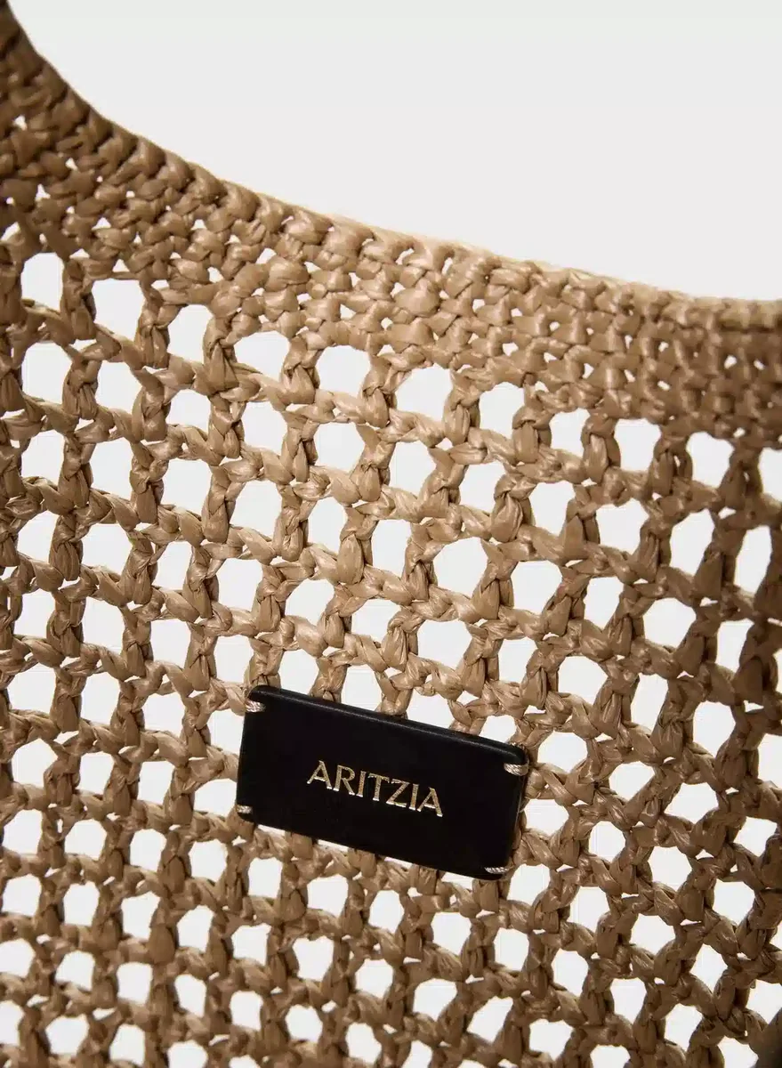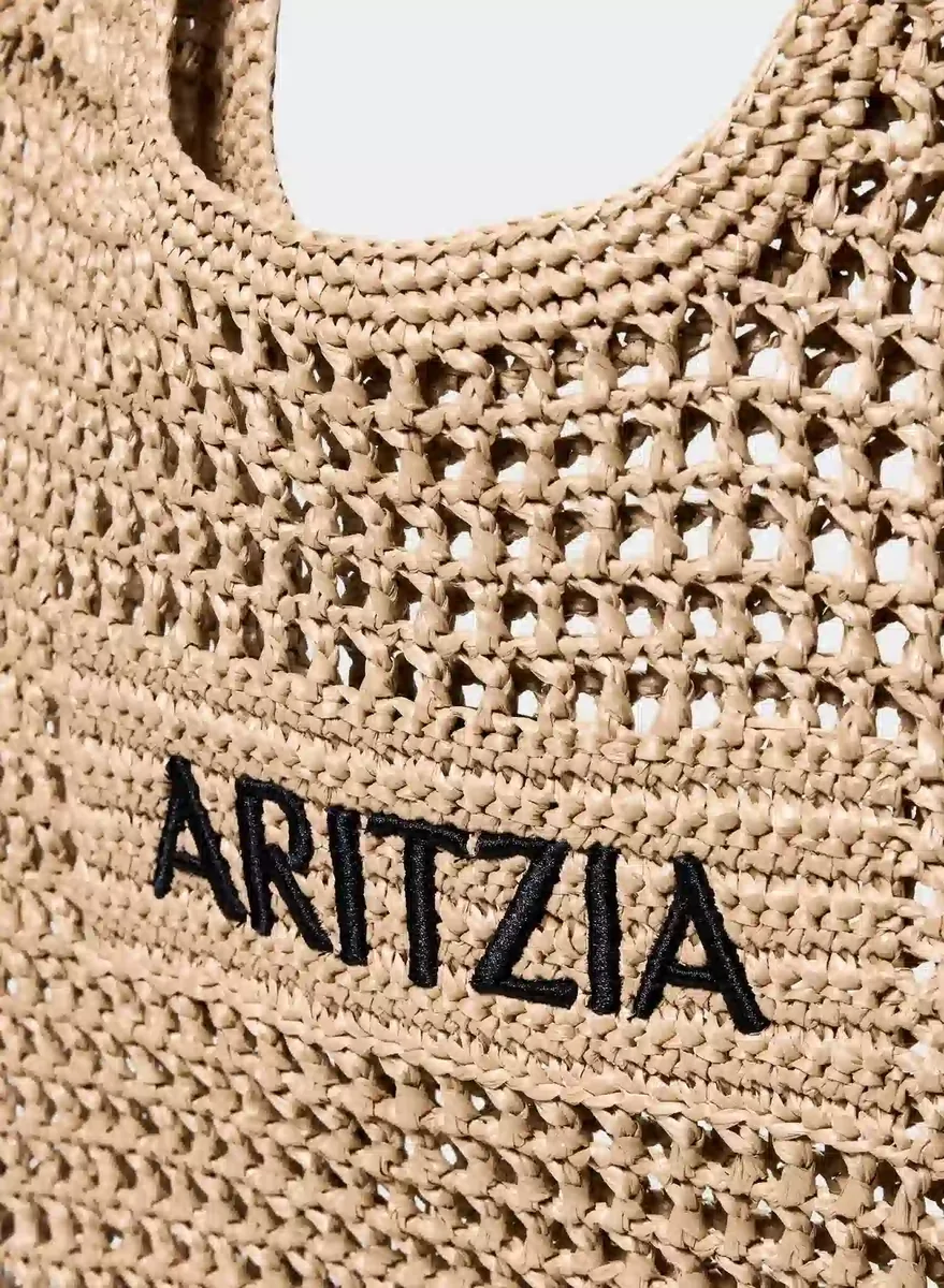 Die Amalfiküste ruft. Dies ist eine Tragetasche mit exklusivem Aritzia-Branding. Sie besteht aus leichtem, raffiaähnlichem Material und wird von Hand gefertigt, sodass keine zwei Taschen genau gleich sind.