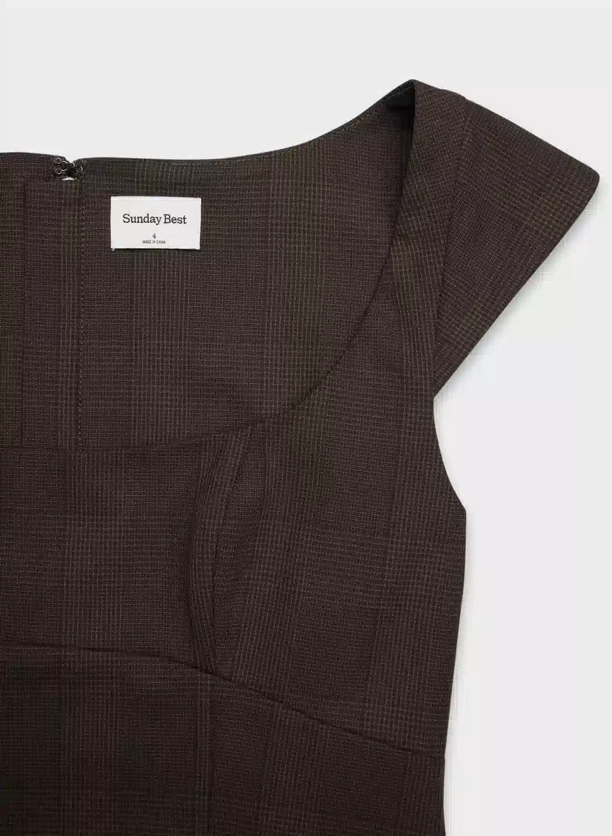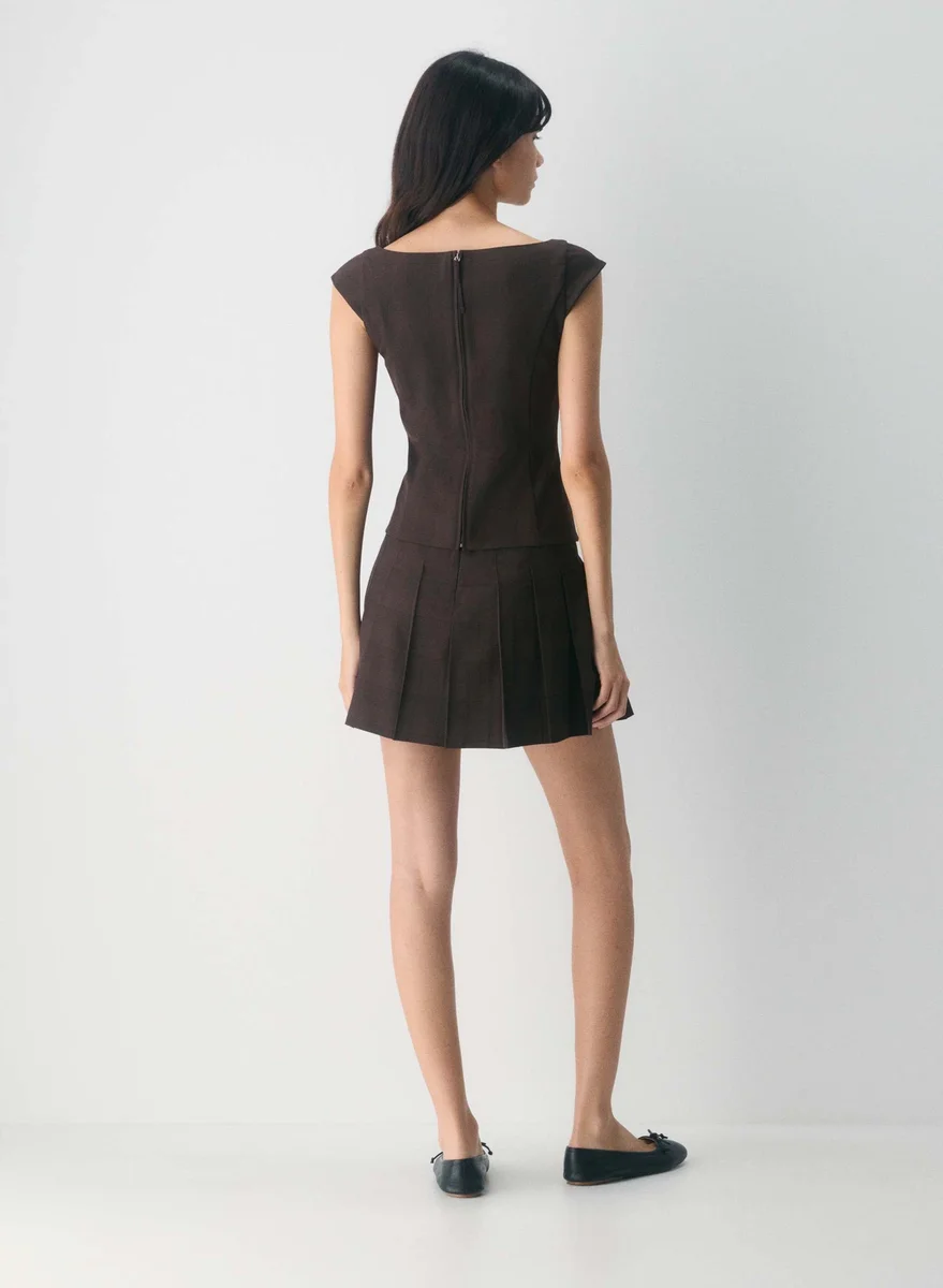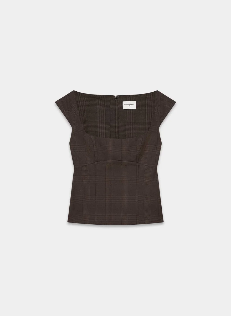 Dies ist ein Bustier-Top mit U-Ausschnitt, Flügelärmeln und Prinzessnähten für eine schöne Passform. Es ist aus einem weich strukturierten Anzugstoff mit glatter Haptik gefertigt. Dieser Stoff stammt aus einer führenden portugiesischen Weberei und besteht aus 60 % recyceltem Polyester und 29 % LENZING™ ECOVERO™ Viskose.