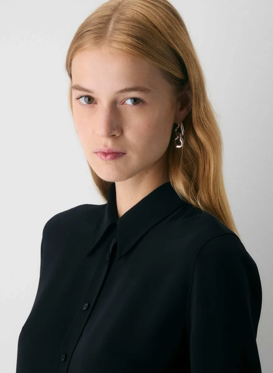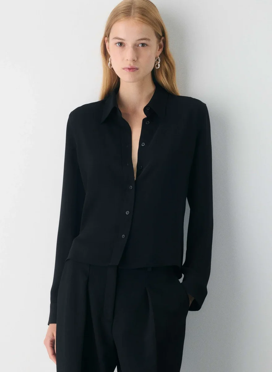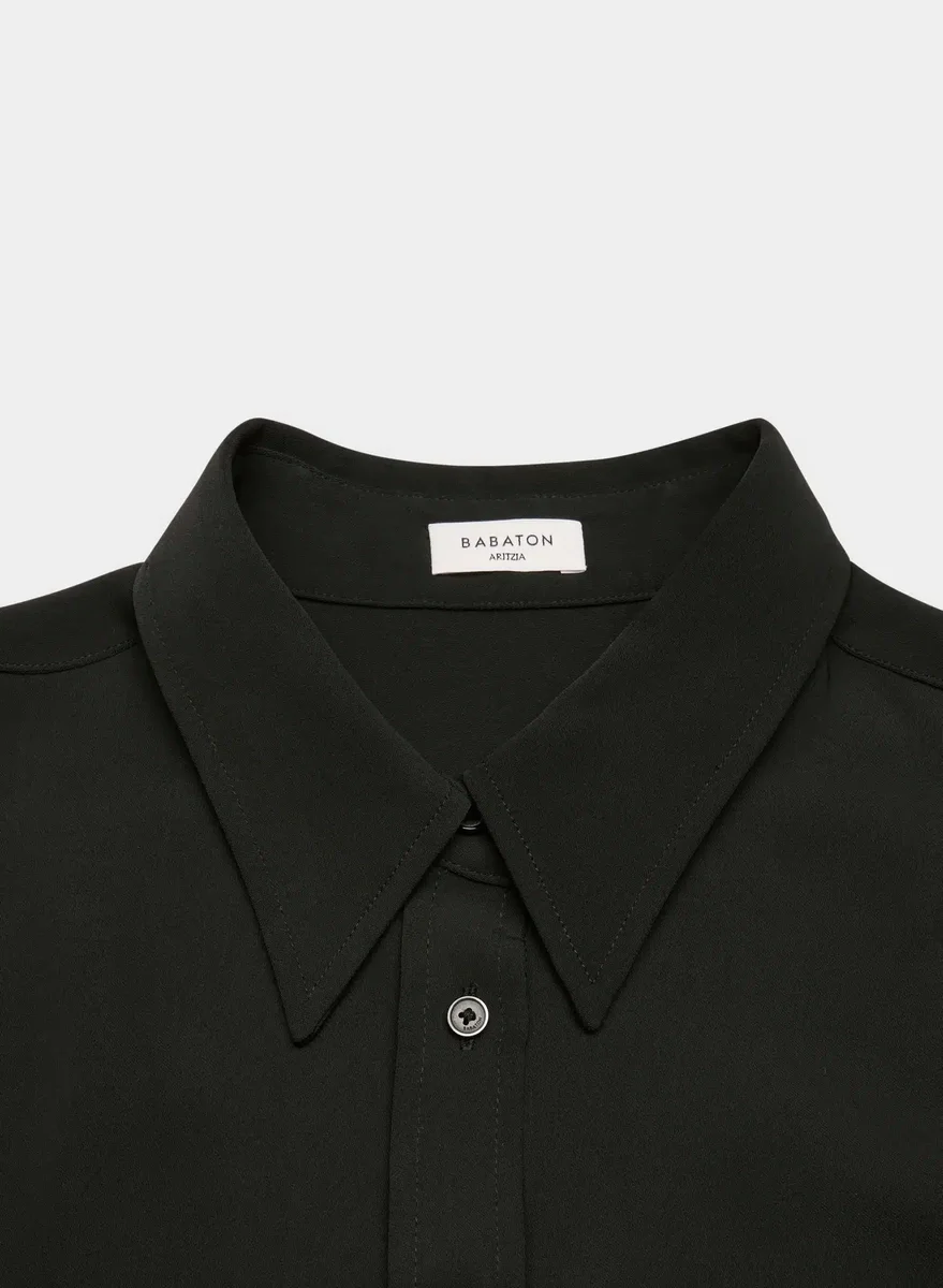 Dies ist ein Hemd mit Knöpfen und verstellbaren Manschetten. Es ist aus Studio Drape geschnitten – einem fließenden, matten Satin mit glatter Optik und leichtem Tragegefühl. Dieser Stoff besteht zu 50 % aus recyceltem Polyester.
