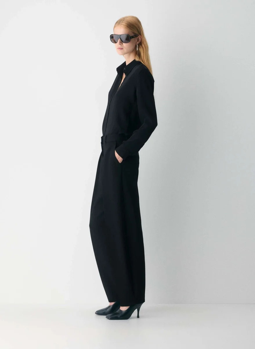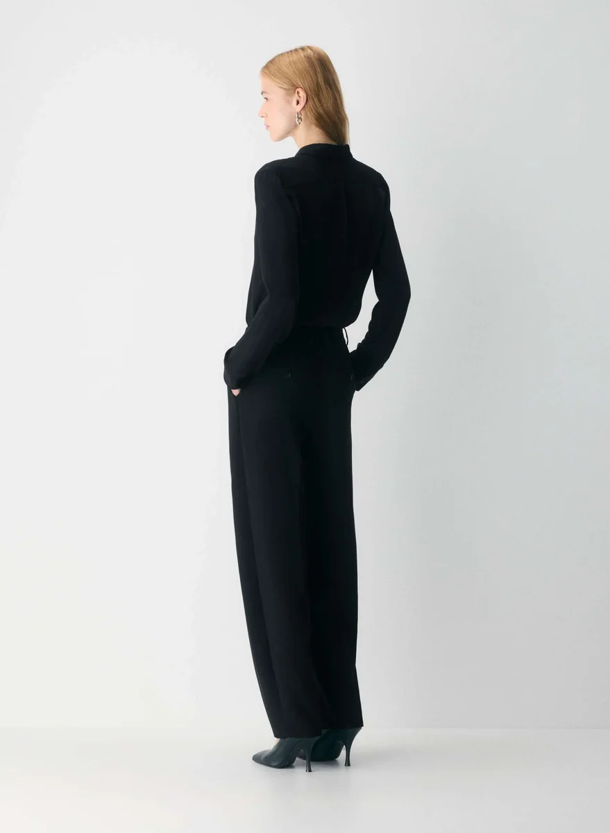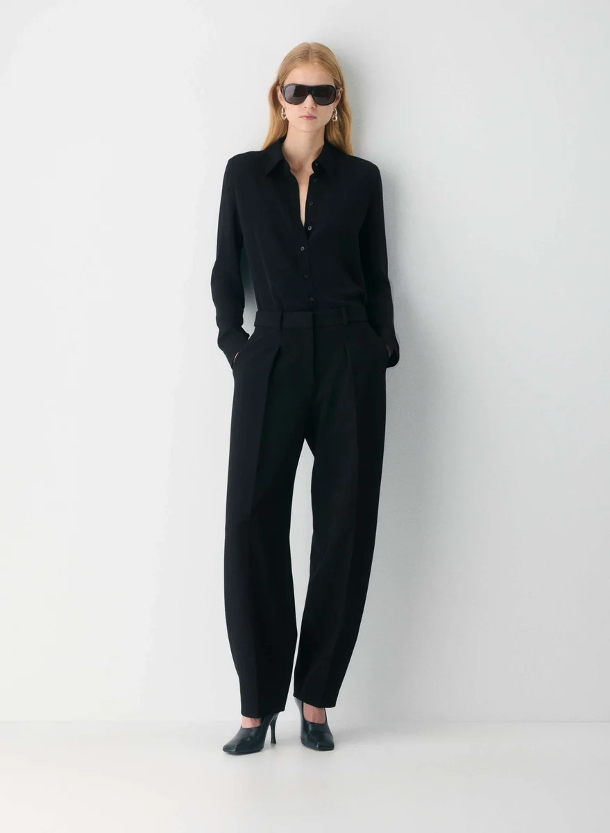 Dies ist ein Hemd mit Knöpfen und verstellbaren Manschetten. Es ist aus Studio Drape geschnitten – einem fließenden, matten Satin mit glatter Optik und leichtem Tragegefühl. Dieser Stoff besteht zu 50 % aus recyceltem Polyester.