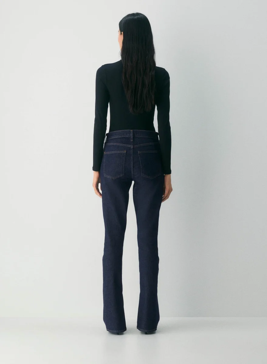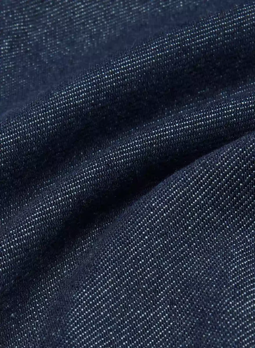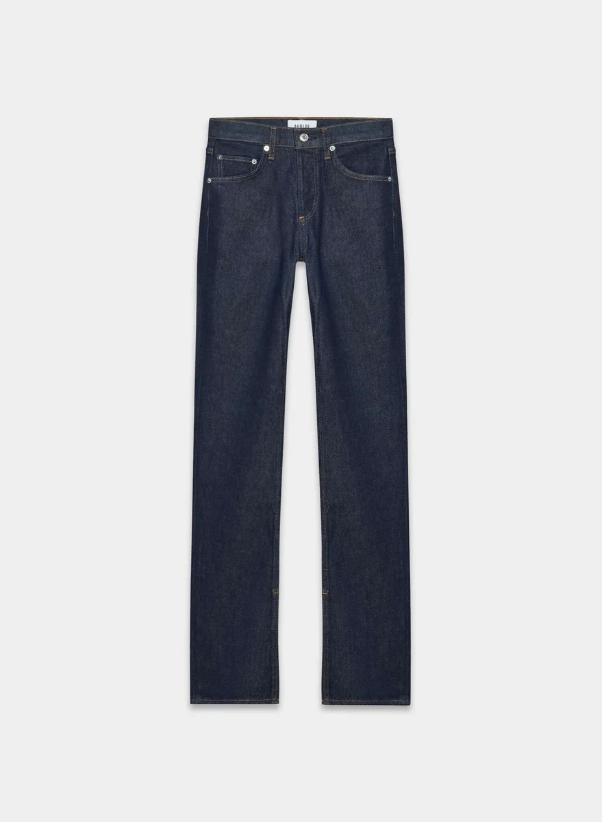 Dies sind Jeans mit hoher Taille und schmalem Bein. Sie sind aus schwerer regenerativer Baumwolle mit einem Hauch von Stretch gefertigt. Diese Version ist in dunklem Indigo erhältlich.