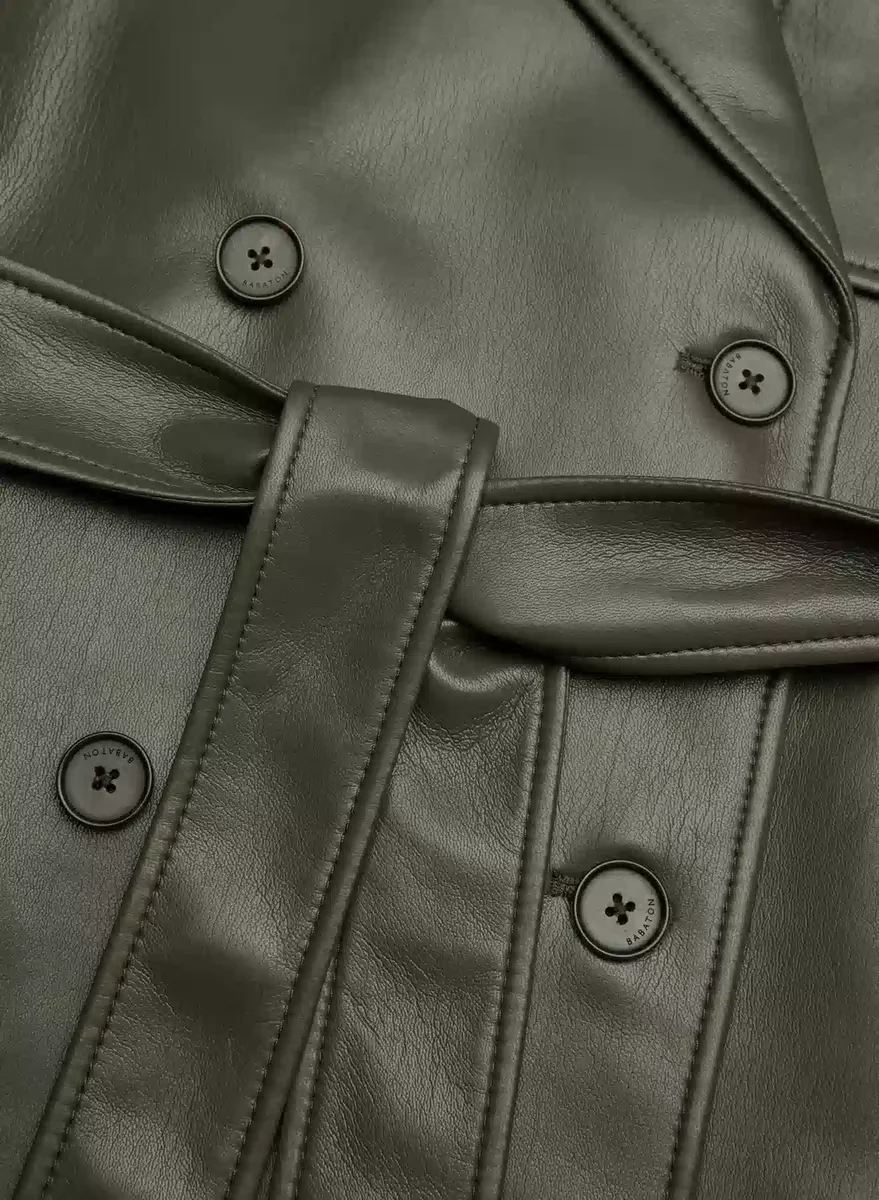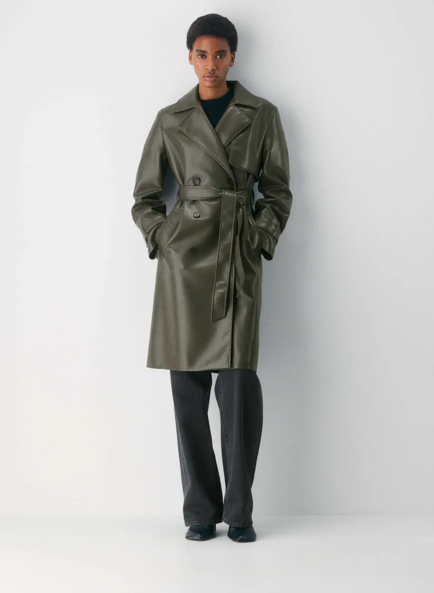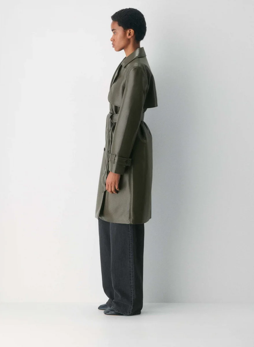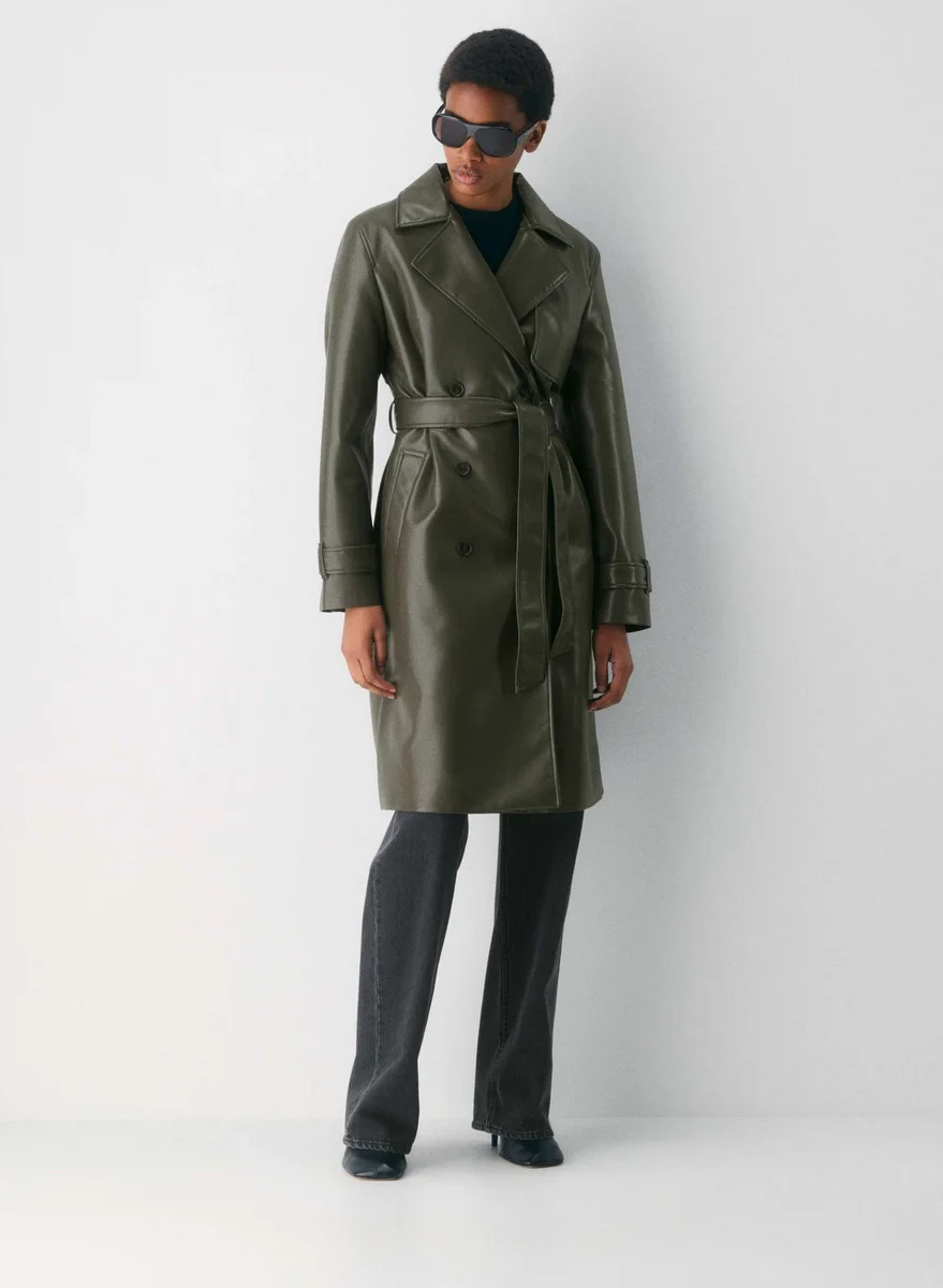 Doppelreihiger langer Trenchcoat aus UnReal Leather