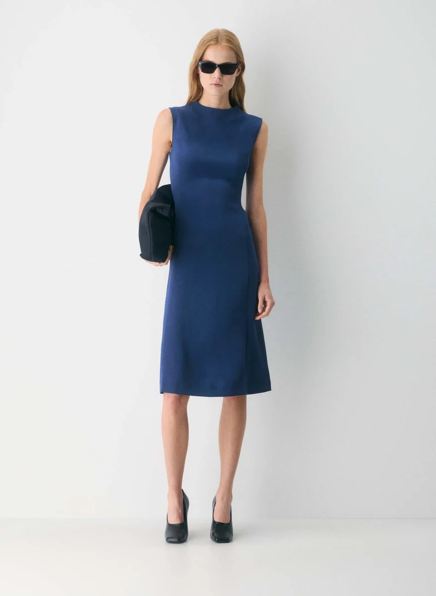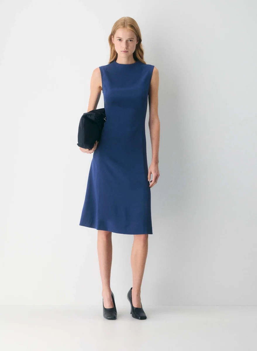 Dies ist ein ärmelloses Midi-Kleid mit Stehkragen und Prinzessnähten für eine schöne Passform. Es ist aus Mirror Crepe™ gefertigt – einem unverzichtbaren Crêpe-Stoff mit weichem Fall und seidigem Satinrücken. Es stammt aus einer innovativen japanischen Weberei und besteht zu 82 % aus Triacetat, Holzfasern aus verantwortungsvoll bewirtschafteten Wäldern, in denen der Schutz der Ökosysteme im Vordergrund steht.