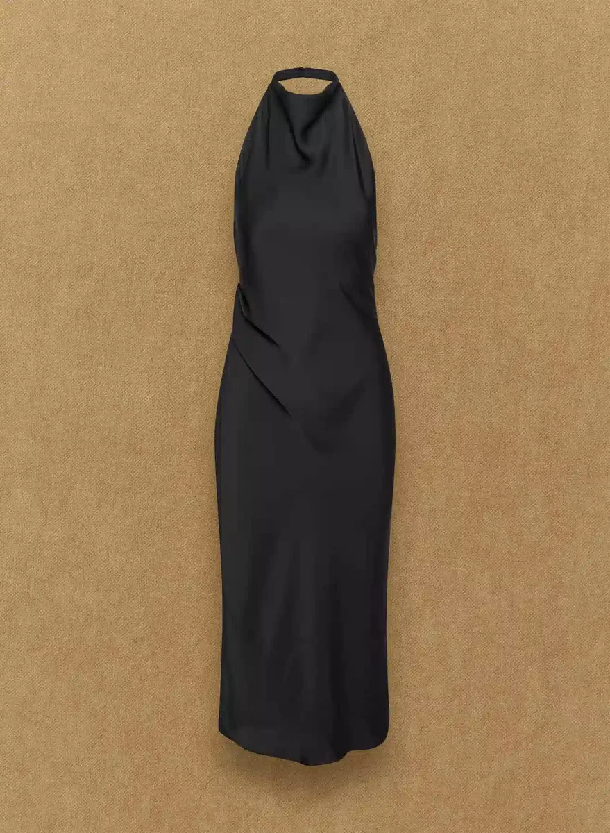 Lust auf Satin? Dies ist ein Neckholder-Kleid mit schmaler Passform. Es ist aus fließendem japanischem doppelseitigem Satin mit sanftem Glanz und luxuriösem Tragegefühl geschnitten.