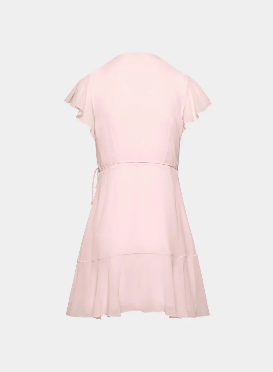 Ein Grund für eine Gartenparty Dieses Wickelkleid mit V-Ausschnitt hat einen gerüschten Saum und einen Bindegürtel. Es ist aus Fête Chiffon™ gefertigt – einem leichten, halbtransparenten Stoff.