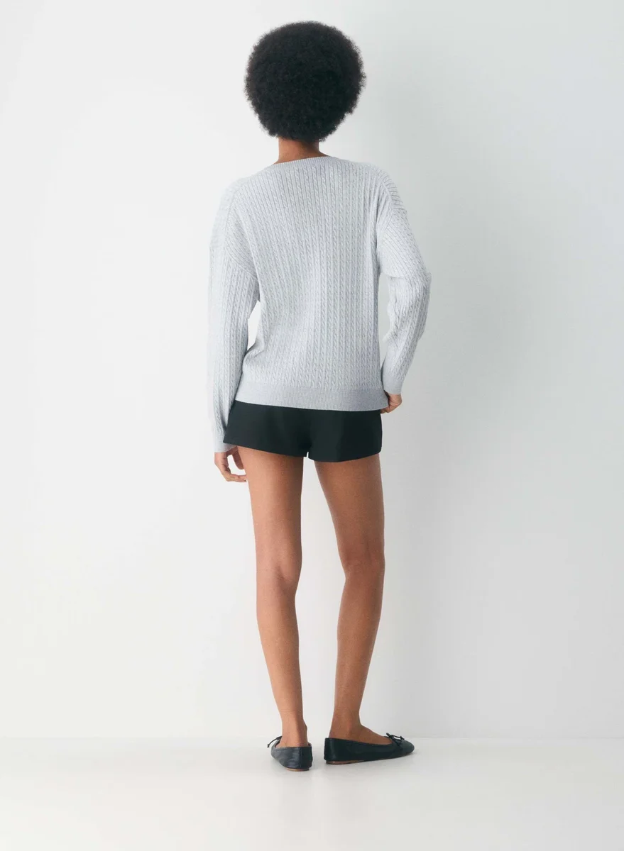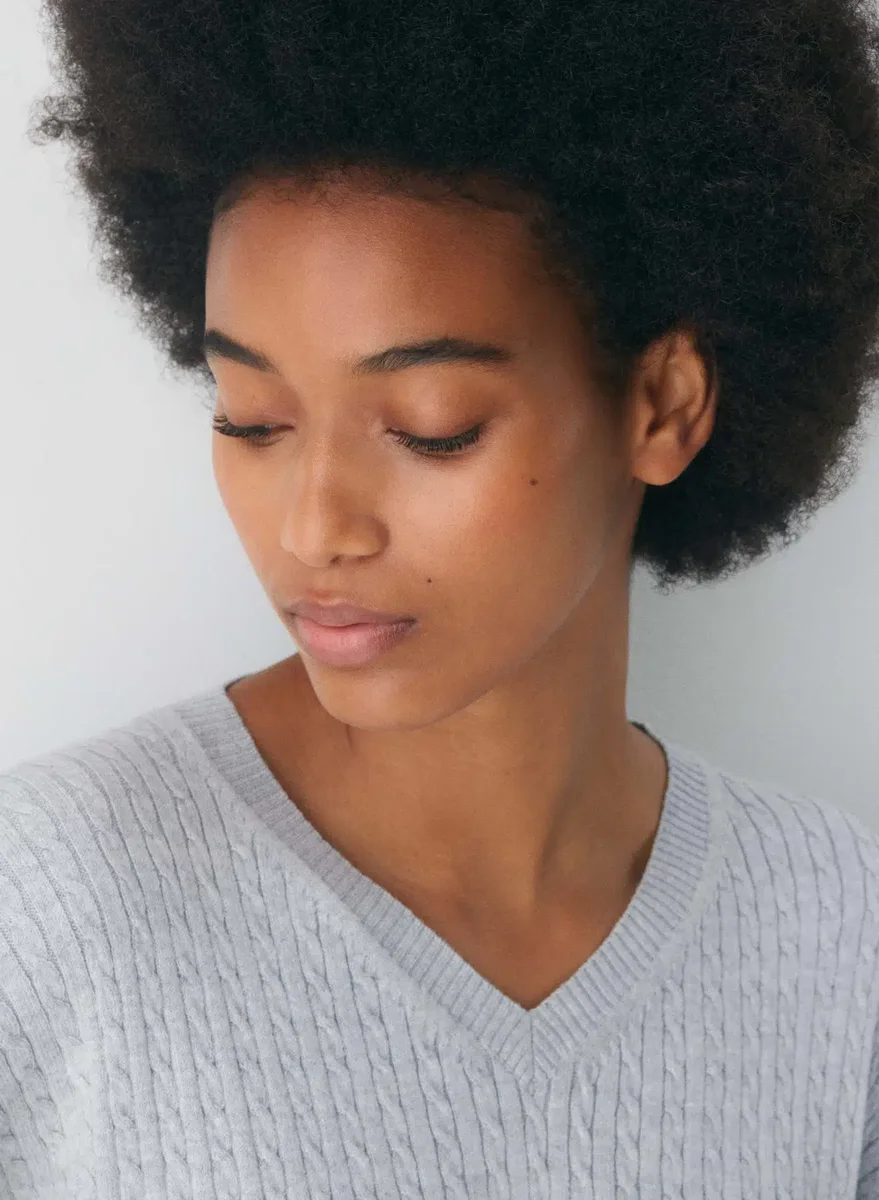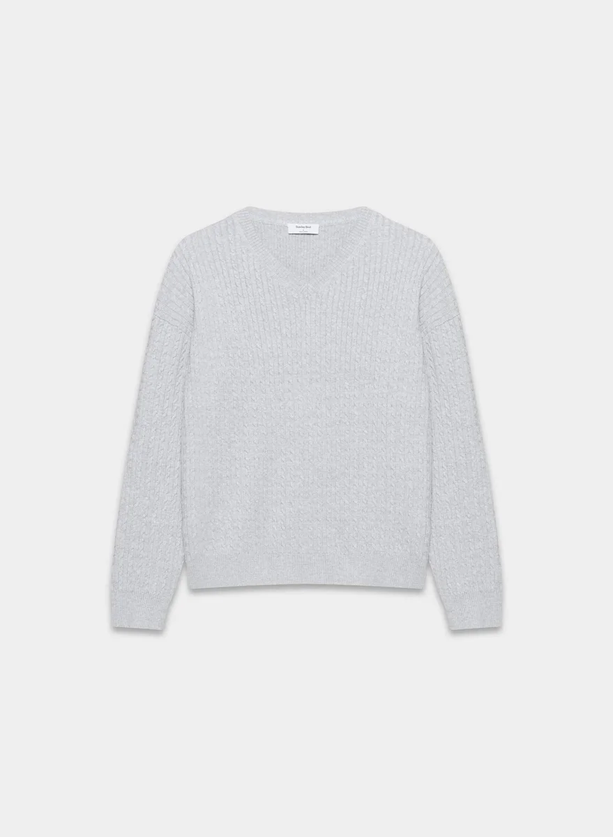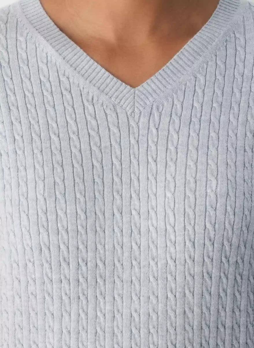 Dies ist ein vollgeformter Pullover mit V-Ausschnitt und klassischer Passform. Er ist aus Cotton Charm™ gestrickt – einem Garn aus Bio-Baumwolle und Kaschmir, das außergewöhnlich weich ist und sich perfekt für das ganze Jahr eignet. Dieses Kleidungsstück ist mit einem Zopfmuster in einem einzigartigen, maßgeschneiderten Design für einen dreidimensionalen Look und eine besondere Textur gefertigt.