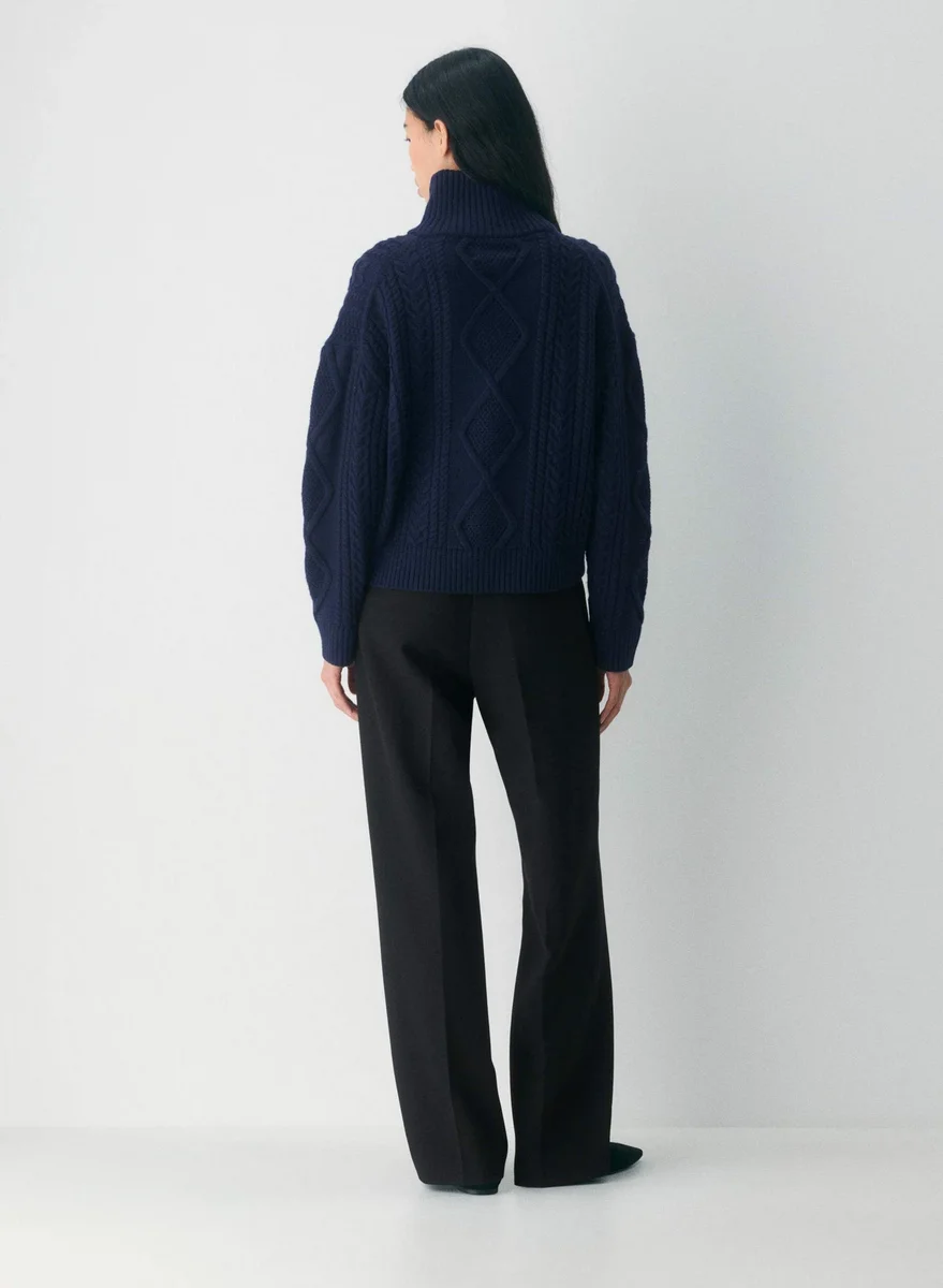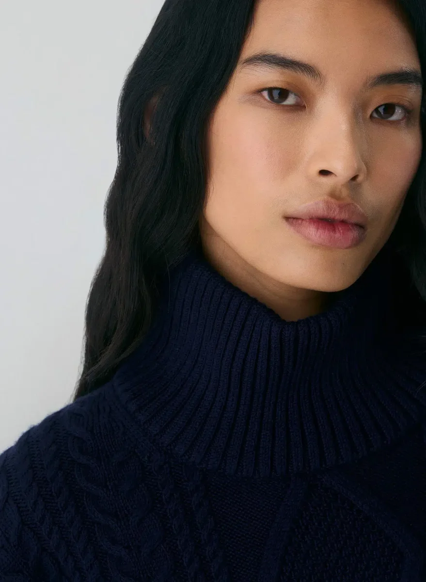 Dies ist ein Rollkragenpullover mit lockerer Passform. Er ist aus Aritzias Merinowolle gestrickt – einem hochwertigen Garn aus 100 % extrafeiner Merinowolle, das für seine natürliche Wärme und seinen weichen Griff geschätzt wird. Dieses luxuriöse Garn wird aus verantwortungsvoll gewonnener Wolle hergestellt. Diese Version wurde mit unserem Harbour Cable-Strickmuster gefertigt, einem Rautenmuster mit Seilakzenten, das für eine strukturierte Optik und Haptik sorgt.