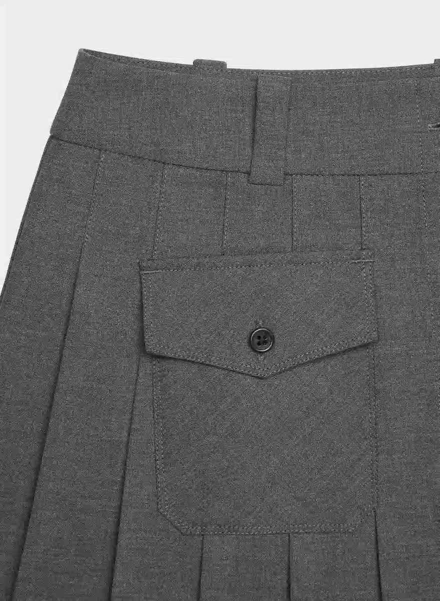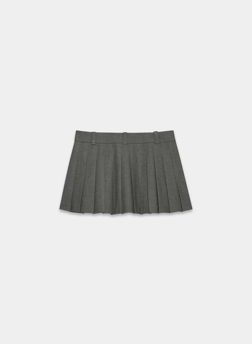 Dies ist ein gefütterter, plissierter Minirock mit Taschen und extrem niedriger Leibhöhe. Er ist aus weich strukturiertem Anzugstoff mit glatter Haptik gefertigt. Dieser Stoff stammt aus einer führenden portugiesischen Weberei und besteht zu 60 % aus recyceltem Polyester und zu 29 % aus LENZING™ ECOVERO™ Viskose.