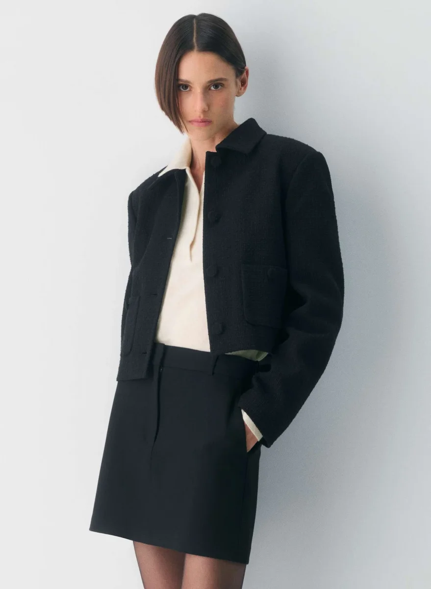 Dies ist ein Mini-Bleistiftrock mit hoher Taille, hosenähnlichen Details und einer Abnäherung am Rücken für eine schöne Passform. Er ist aus (Re)ssential gefertigt – einem weich strukturierten Stretchstoff, der seine Form behält, während Sie sich frei bewegen können. Dieser Stoff stammt aus einer führenden portugiesischen Weberei und besteht aus 54 % recyceltem Polyester und 26 % LENZING™ ECOVERO™ Viskose.
