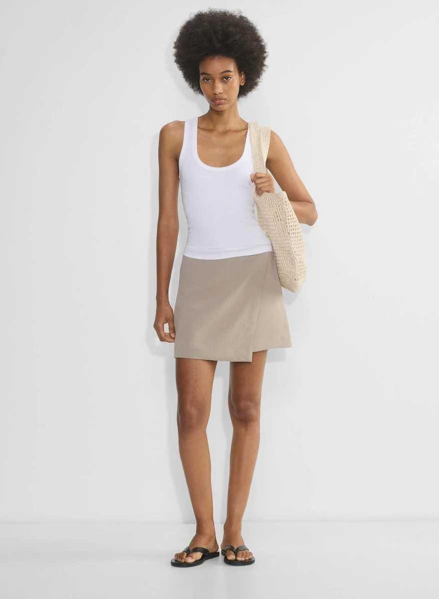 Dies ist ein Wickel-Skort mit integrierten Shorts darunter. Er ist aus Crepette™ gefertigt – unserem einzigartigen japanischen Crepe-Stoff, der wegen seiner subtilen Textur, seinem luftigen Fall und der Tatsache, dass er praktisch nie knittert, sehr beliebt ist.