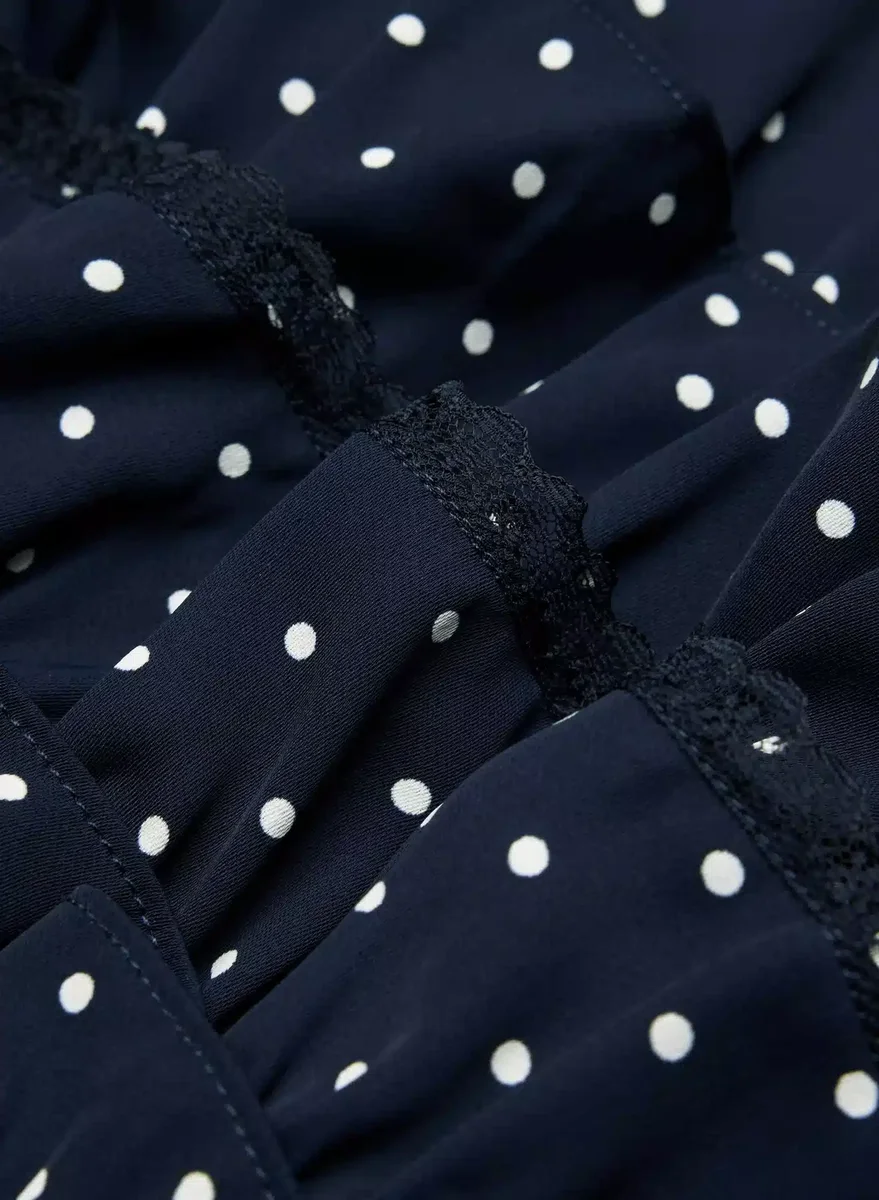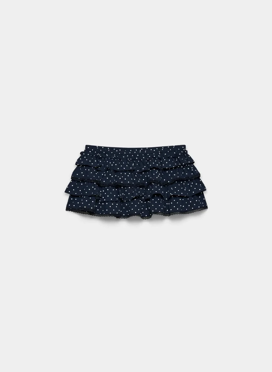 Dies ist eine Rüschen-Shorts mit integrierten Shorts, niedriger Taille und Spitzenbesatz. Sie ist aus drapiertem, mattem Material gefertigt, das sich luxuriös weich auf der Haut anfühlt. Dieser Stoff besteht aus 100 % recyceltem Polyester. Diese Version verfügt über ein exklusives Polka-Dot-Muster.