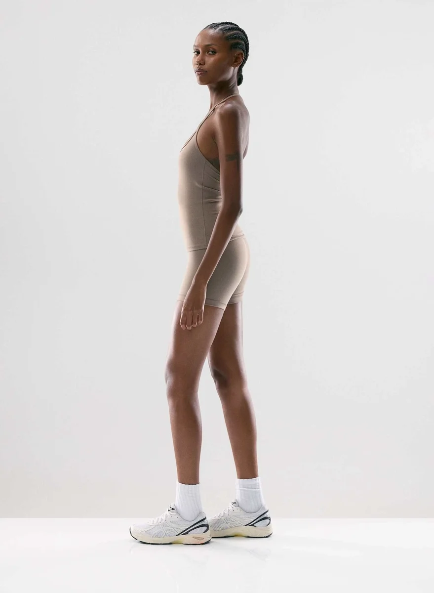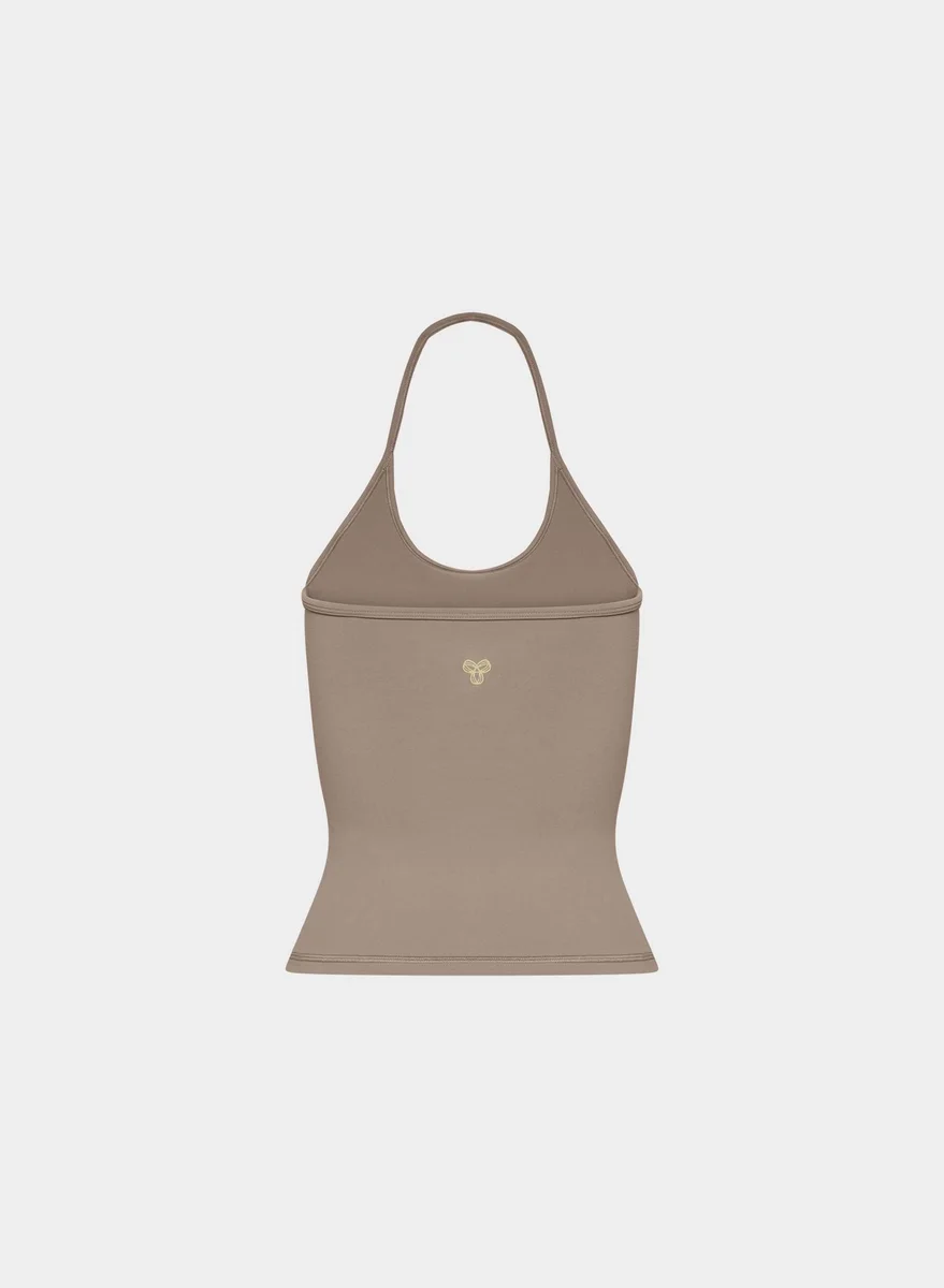 Dies ist ein Top mit Neckholder. Es besteht aus LIFE – einem vielseitigen, figurbetonten Material, das Schweiß ableitet und baumwollweich ist.