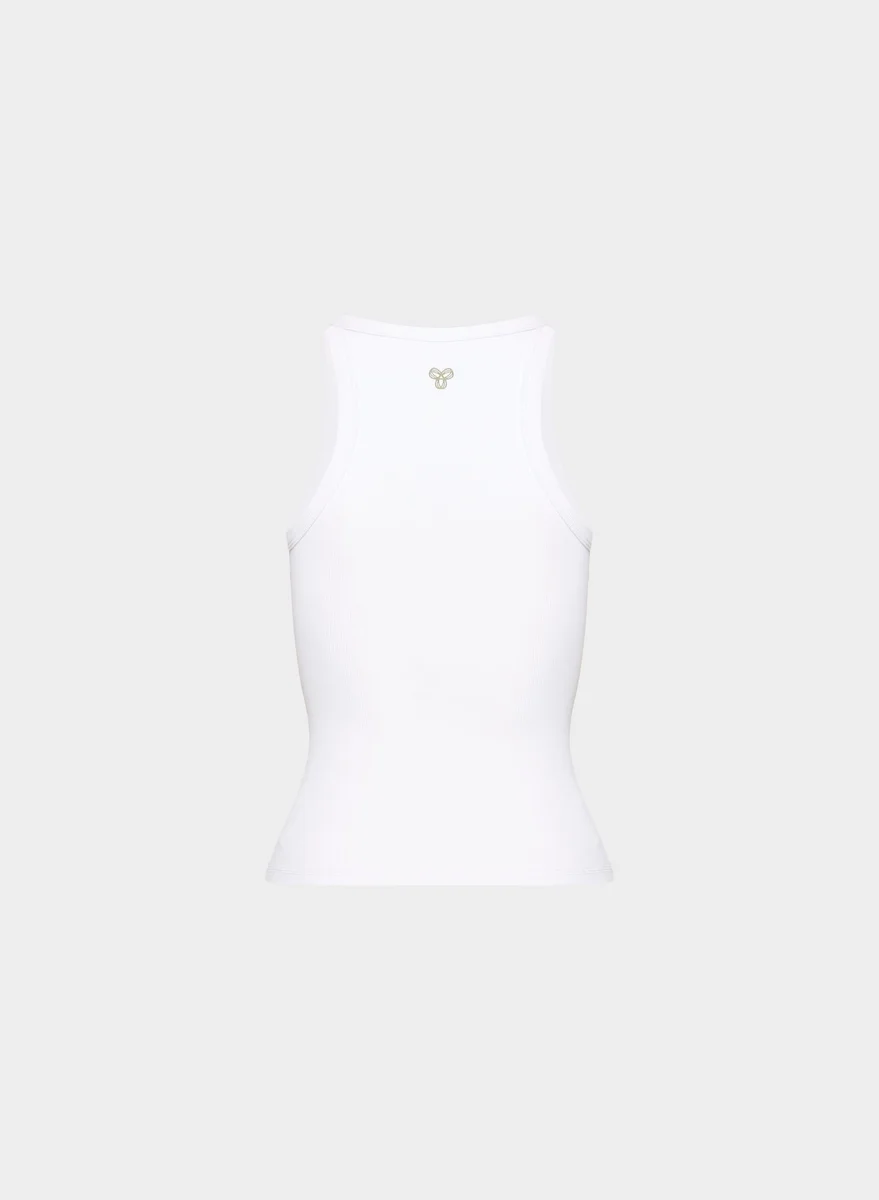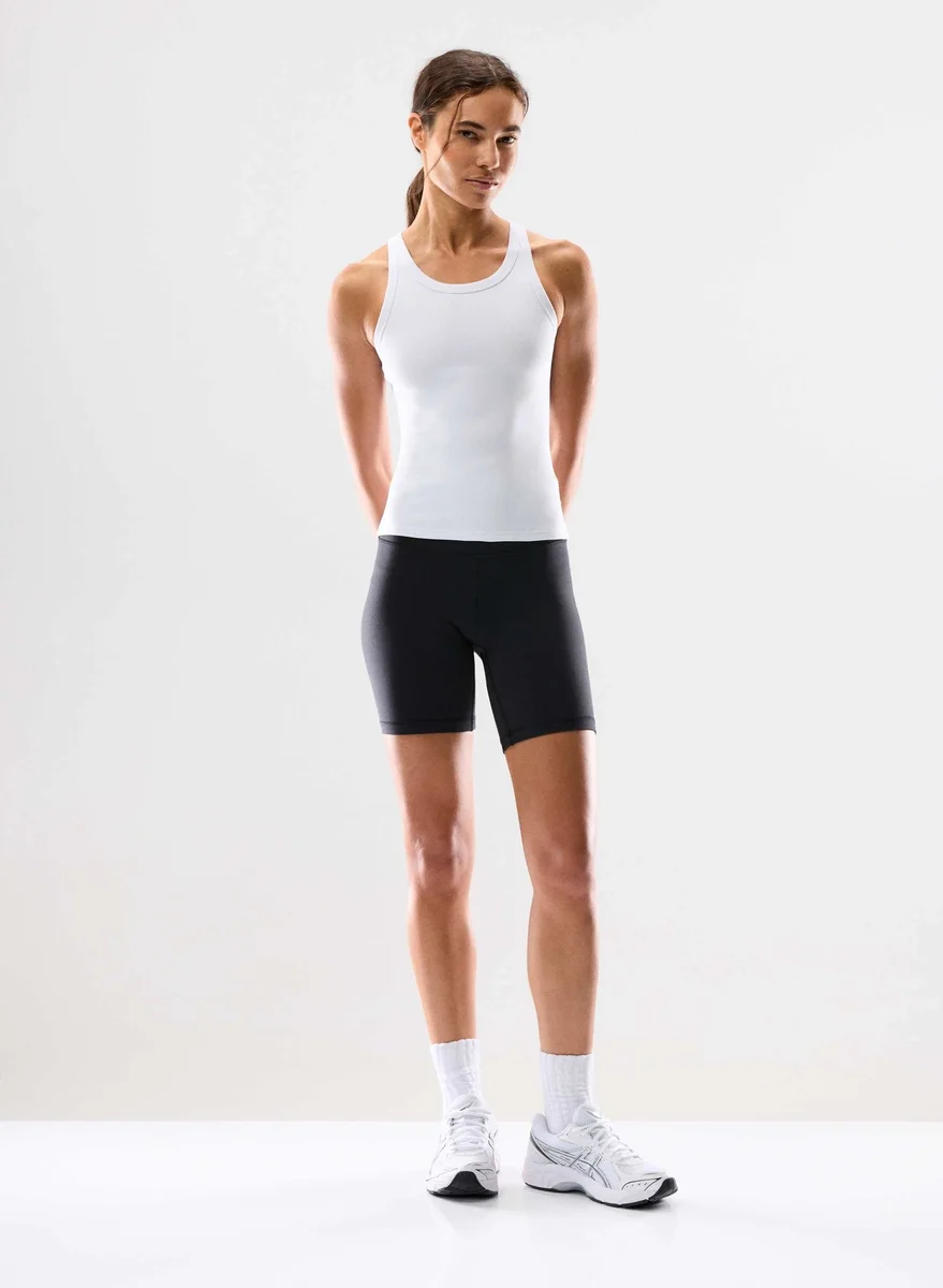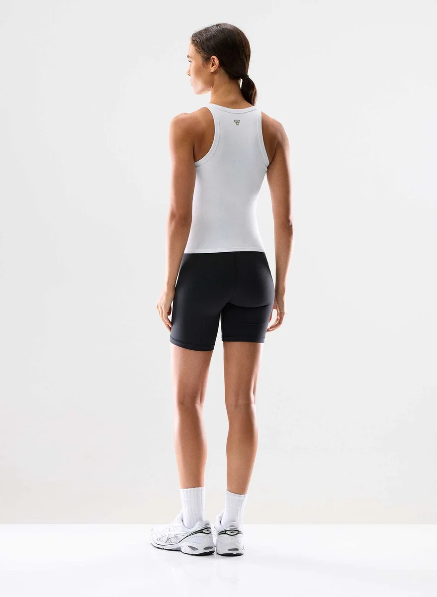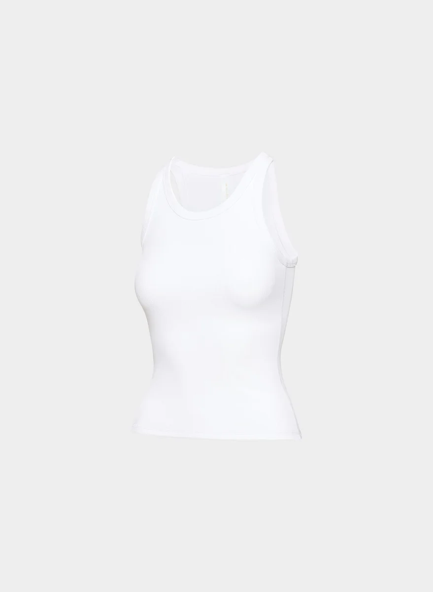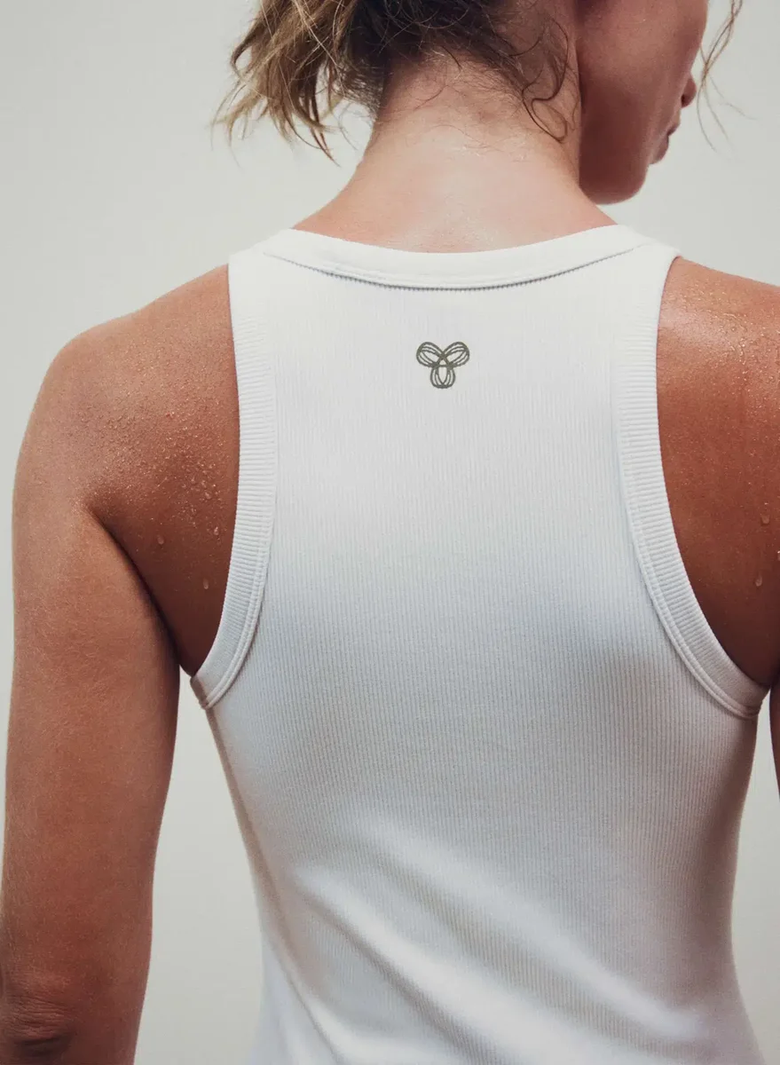 Dies ist ein Tanktop mit Rundhalsausschnitt und Racerback. Es ist aus LIFE Rib gefertigt – einem vielseitigen, körpernahen Stoff, der schweißableitend und baumwollweich ist. Diese Version hat eine gerippte Struktur.