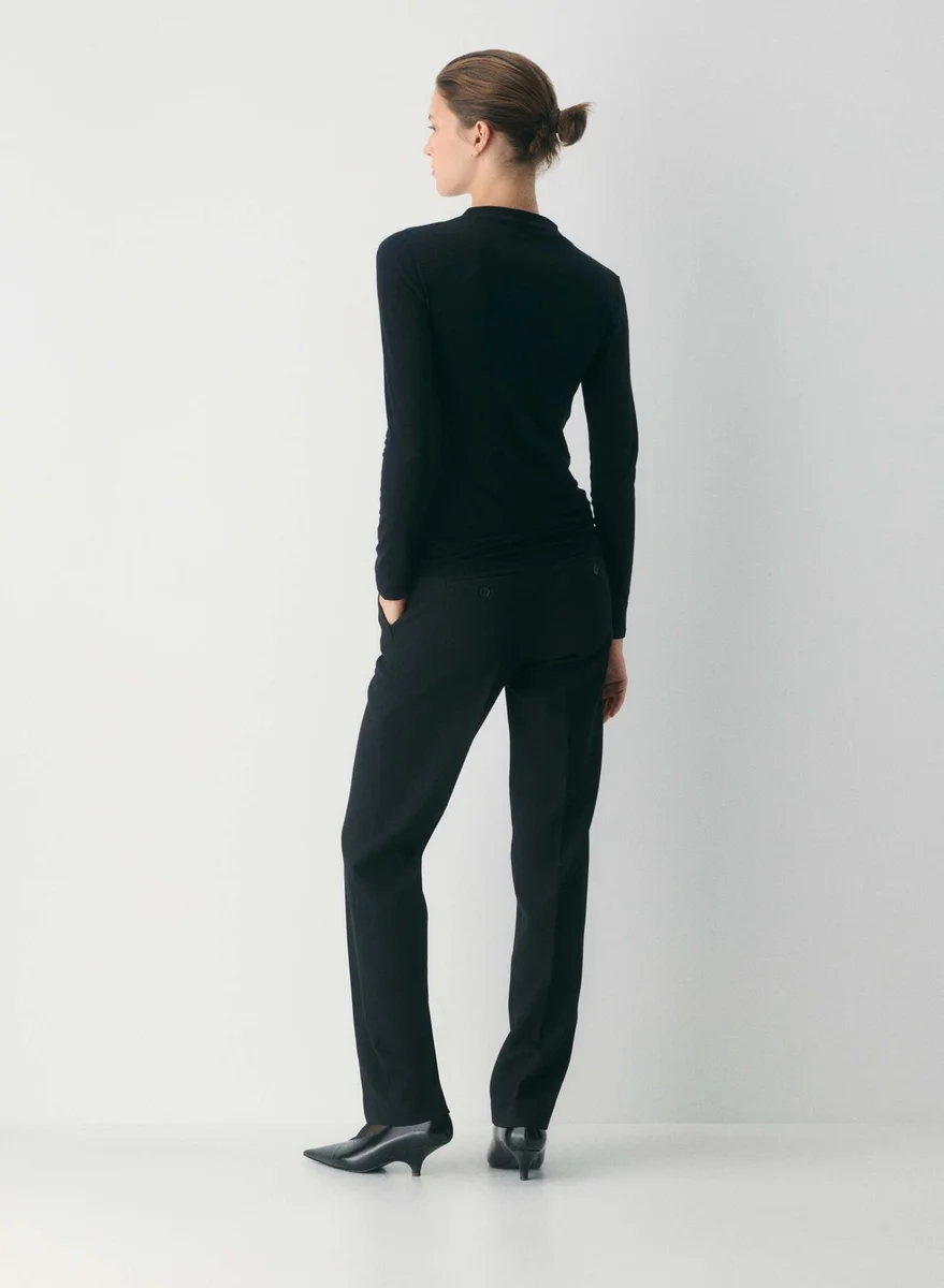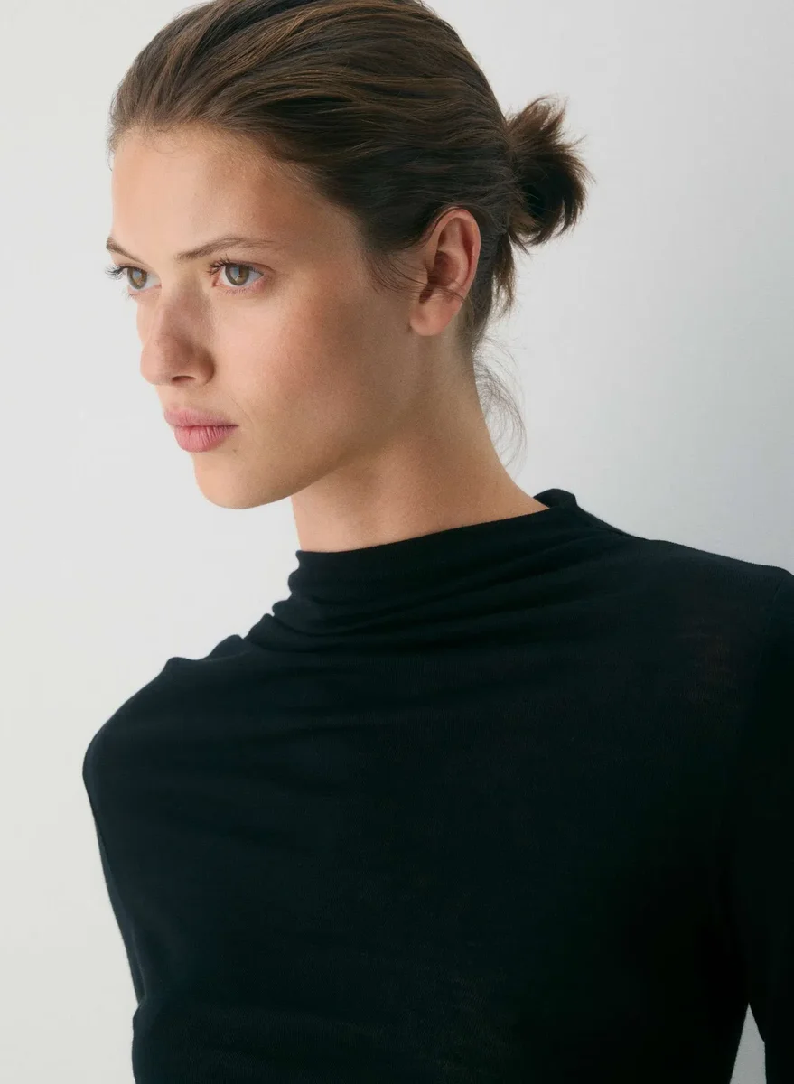 Dies ist ein Langarmshirt mit Stehkragen und drapierter Konstruktion. Es besteht aus leichtem, halbtransparentem Jersey mit weichem Griff. Es besteht zu 93 % aus TENCEL™ Lyocell.