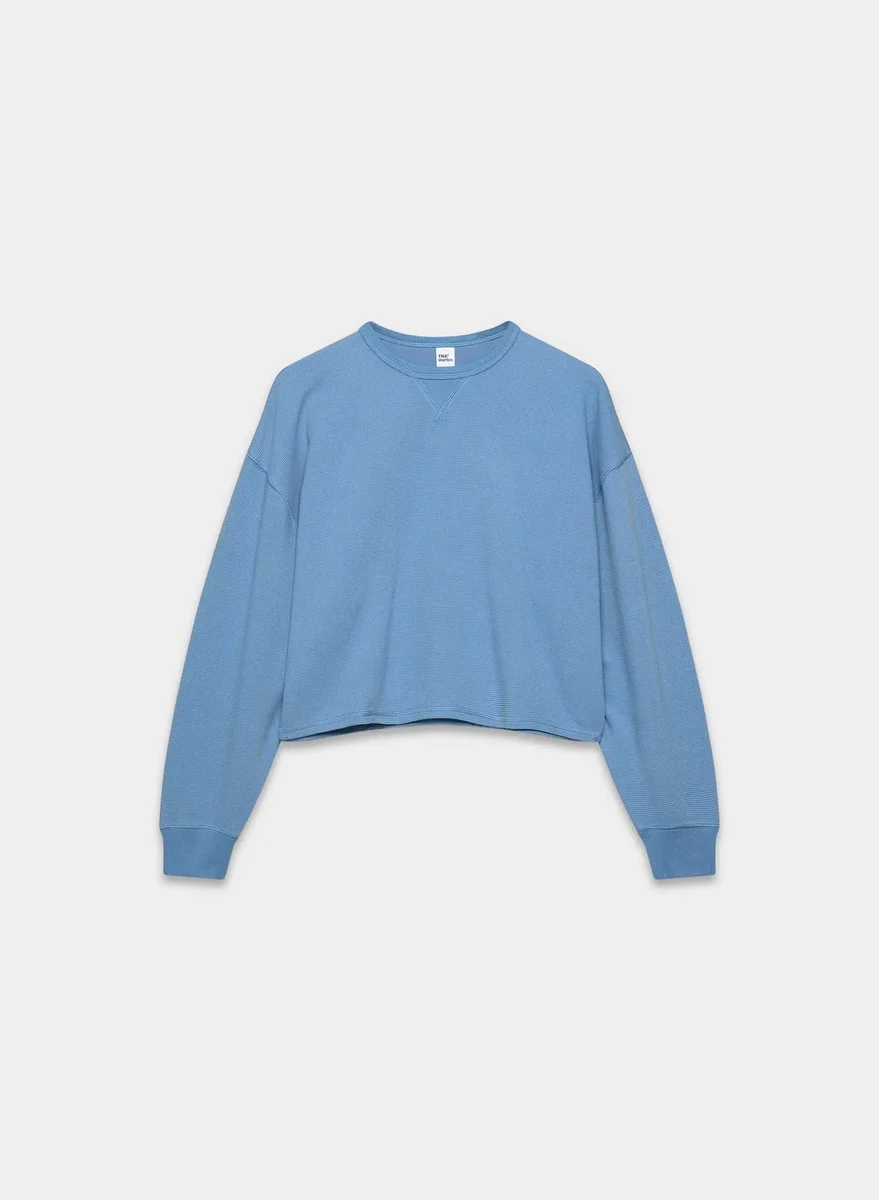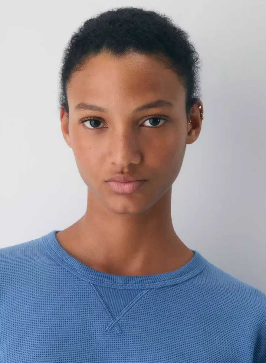 Dies ist ein Langarmshirt mit Rundhalsausschnitt, überschnittenen Schultern und Oversize-Passform. Es besteht aus Wafflex – unserem neuen und verbesserten weichen, dehnbaren, körperbetonten Stoff mit Waffelstrickstruktur. Es besteht zu 54 % aus TENCEL™ Lyocell.