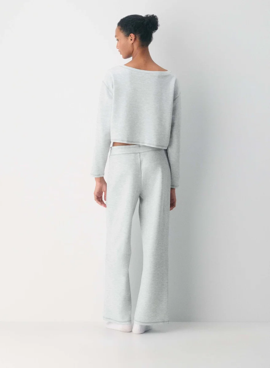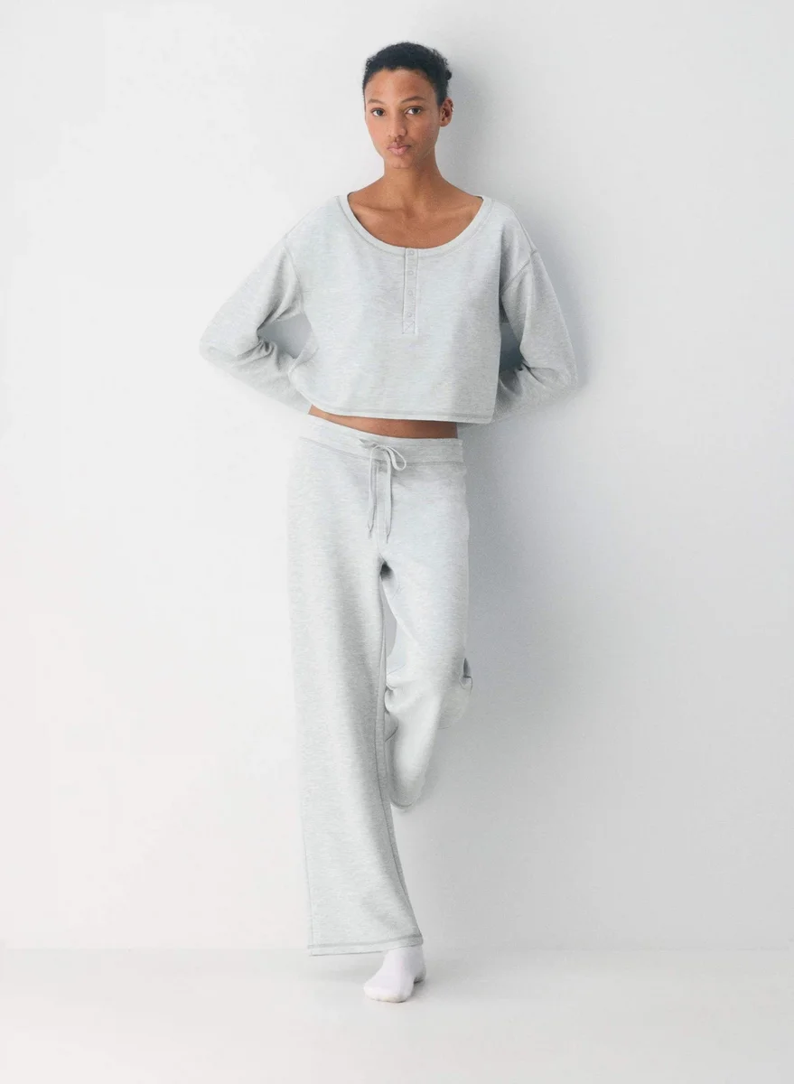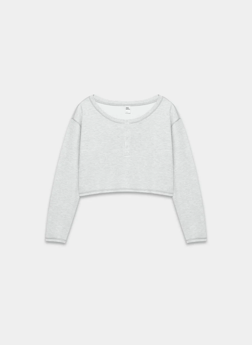Dies ist ein Langarmshirt mit Henley-Kragen und Off-Shoulder-Ausschnitt. Es ist aus Wafflex gefertigt – unserem neuen und verbesserten weichen Stretchstoff, der sich anschmiegt und eine Waffelstrickstruktur hat. Es besteht zu 54 % aus TENCEL™ Lyocell.