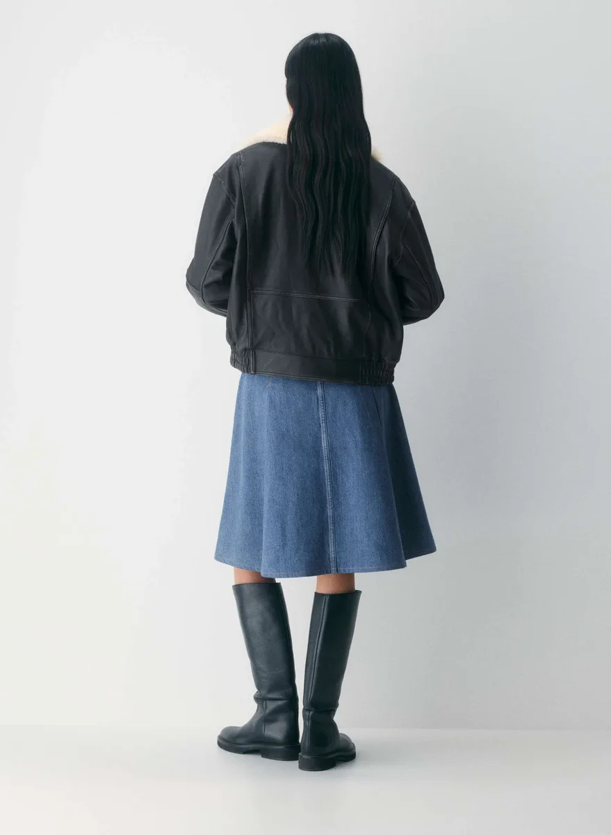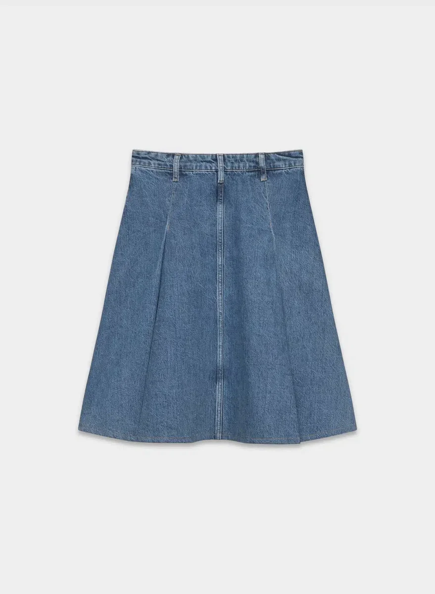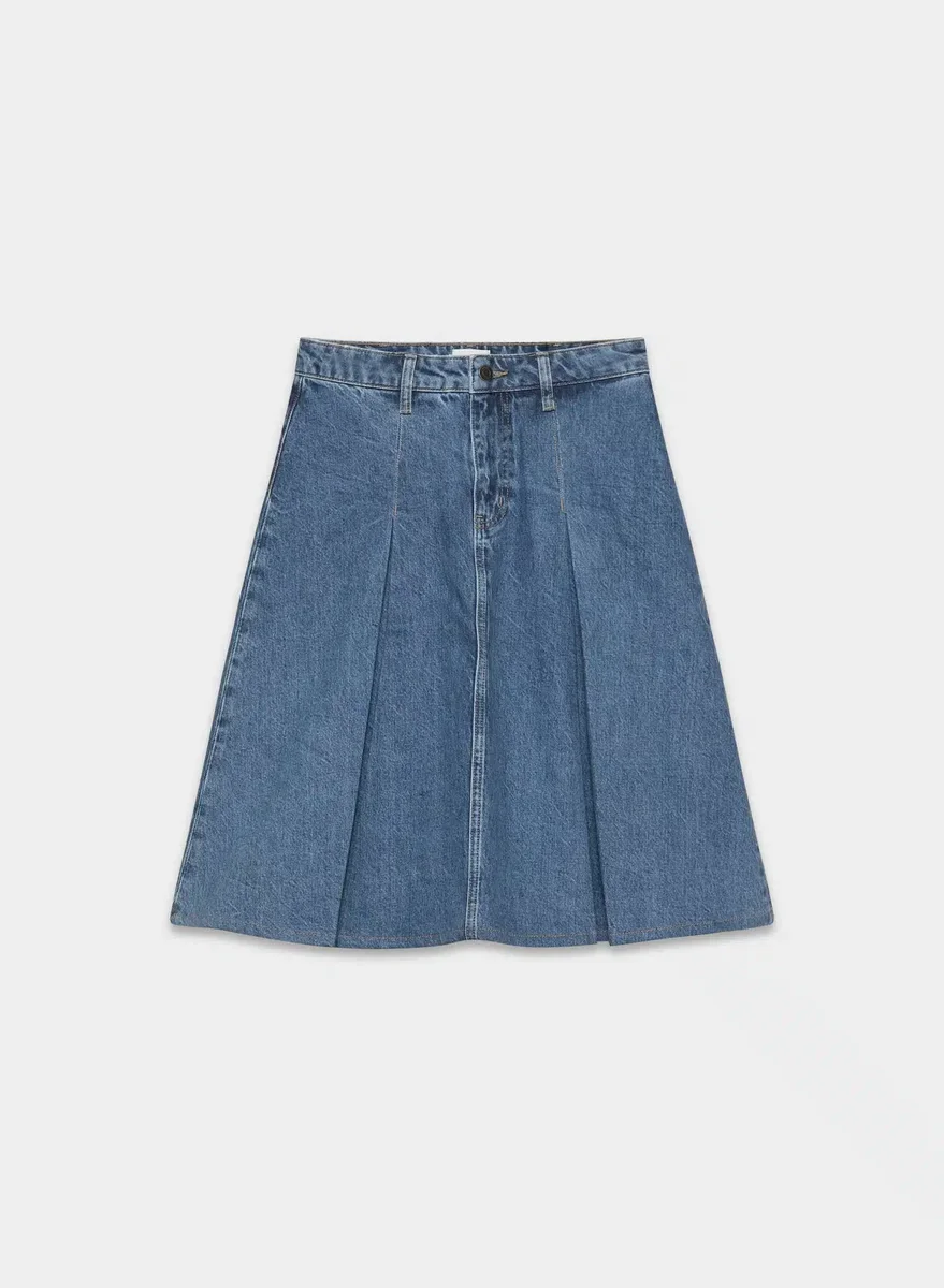 Plissees, bitte Dies ist ein Midirock mit mittlerer Leibhöhe, klassischer Passform und Reißverschluss mit Druckknopfverschluss. Er ist aus weichem, nicht dehnbarem Denim mit genau der richtigen Drapierung geschnitten. Dieser Stoff wird aus regenerativer Baumwolle aus einer erstklassigen italienischen Weberei hergestellt und wird mit jedem Tragen besser.